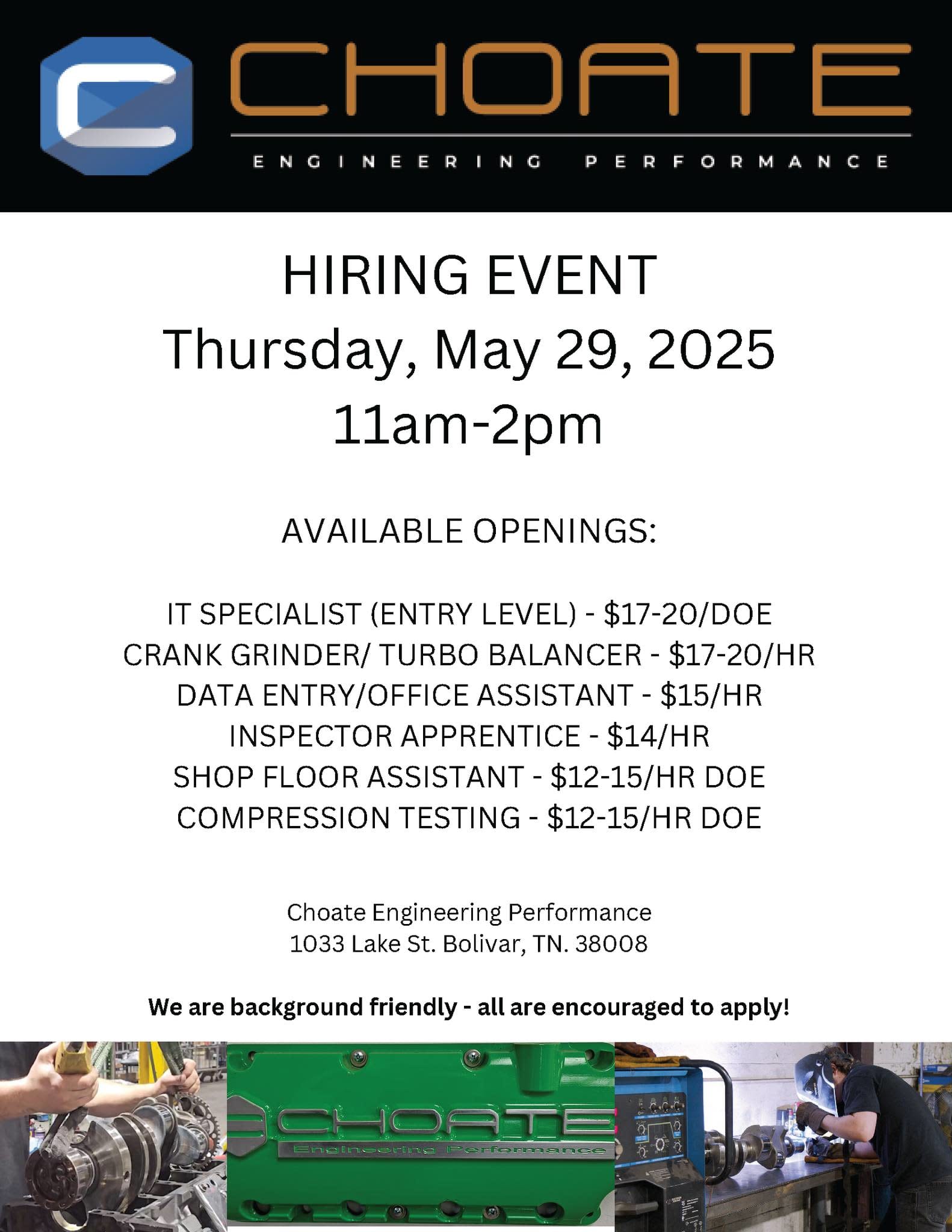 Choate Engineering Performance will be hosting a hiring event on Thursday, May 29, 2025, from 11 AM - 2 PM at their location on 1033 Lake Street in Bolivar! Available openings include IT Specialist, Crank Grinder, Data Entry, Inspector Apprentice, Shop Floor Assistant, and Compression Testing!